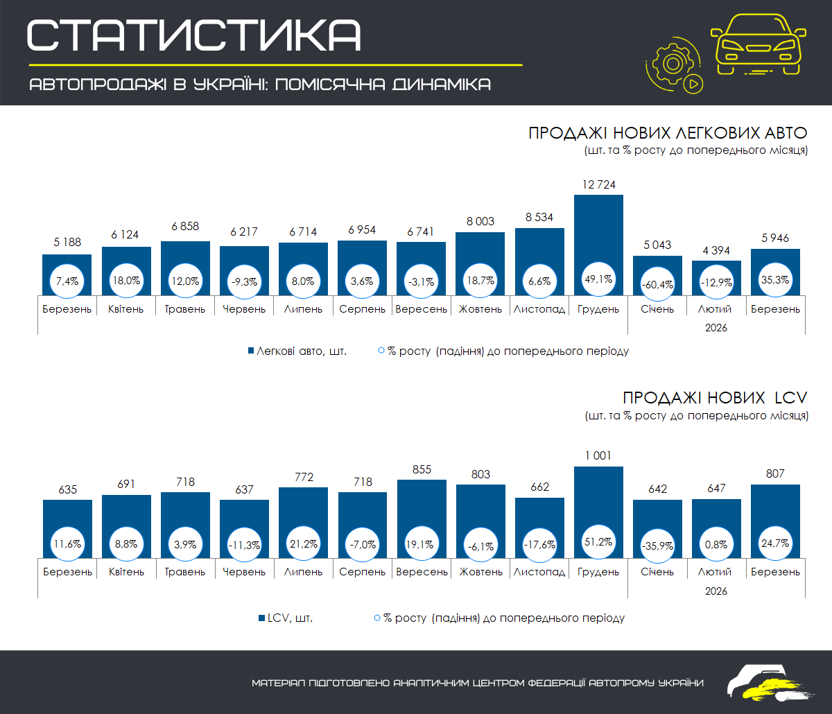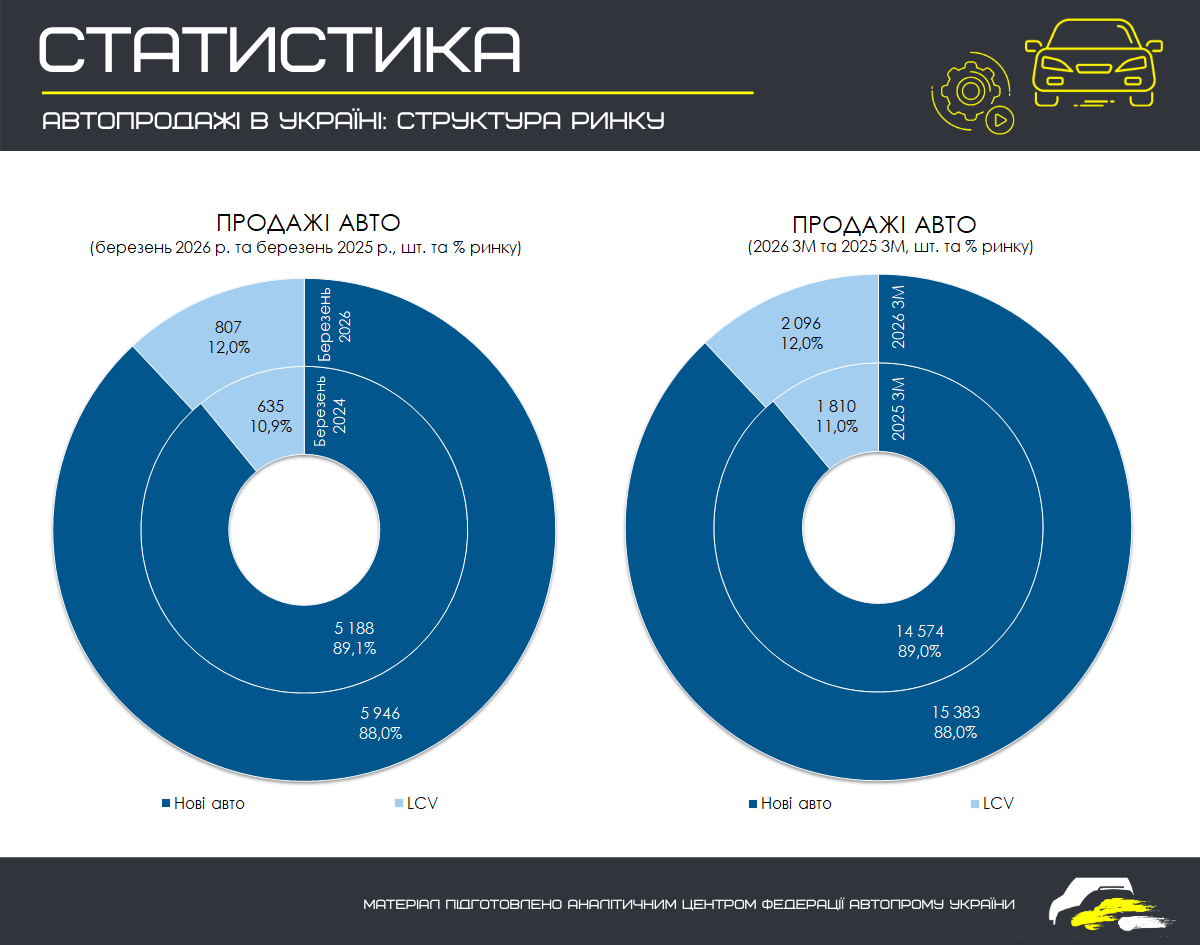 Березень 2026 року продемонстрував відновлення попиту на українському ринку нових легкових автомобілів після слабкого початку року. За даними AUTO-Consulting, дилери реалізували 5,9 тис. авто, що на +35,3% більше, ніж у лютому.