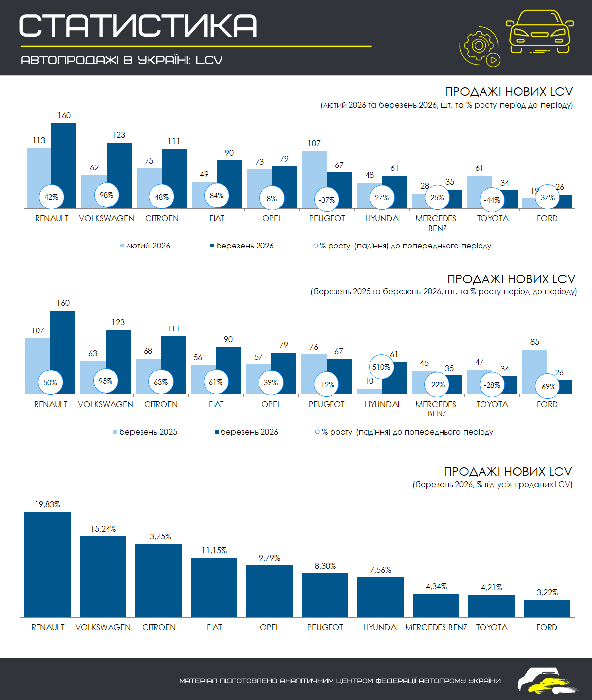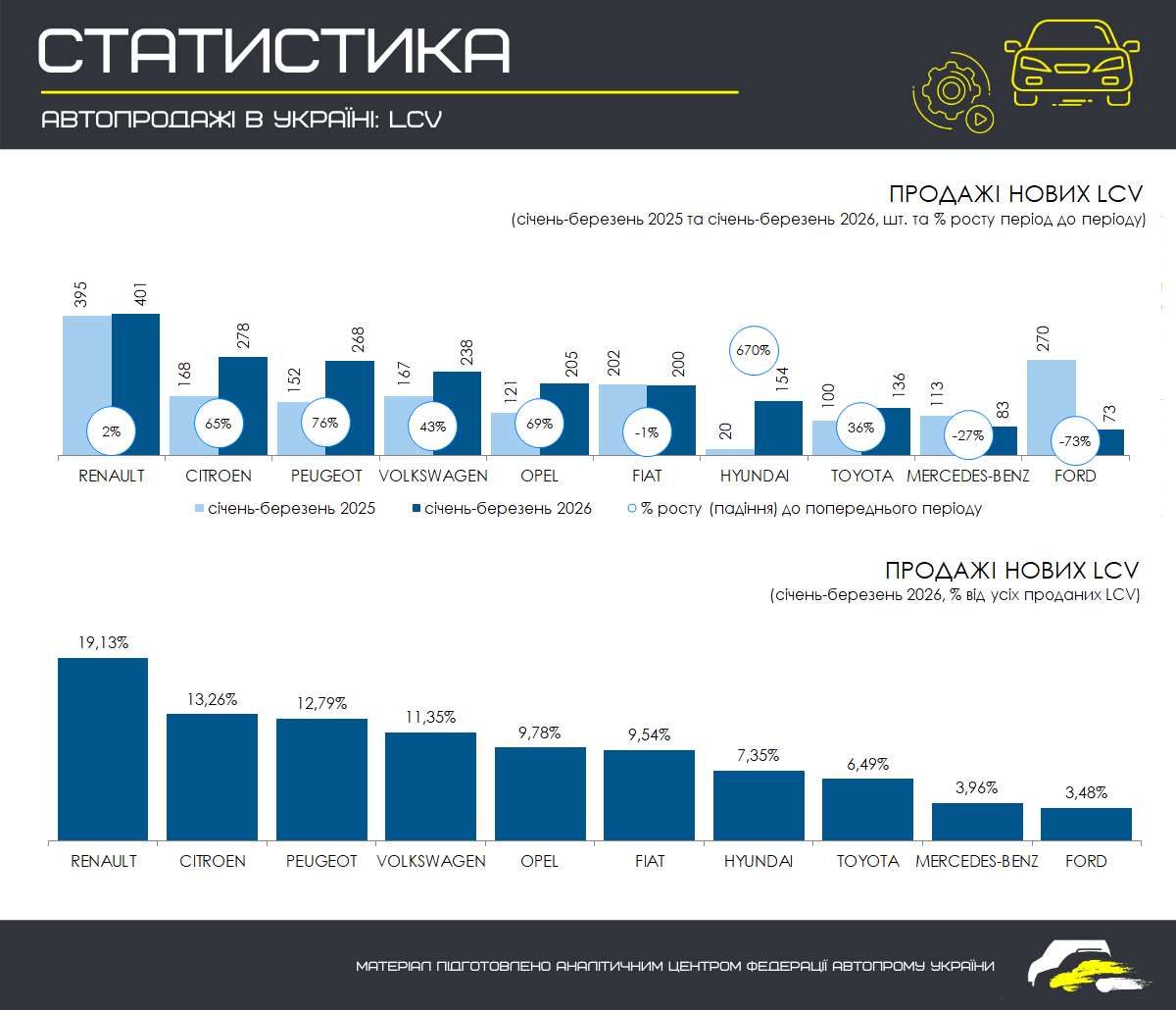 Загалом за січень-березень 2026 року було продано 15 383 нових легкових автомобілів, що на +5,6% більше, ніж за аналогічний період 2025 року.