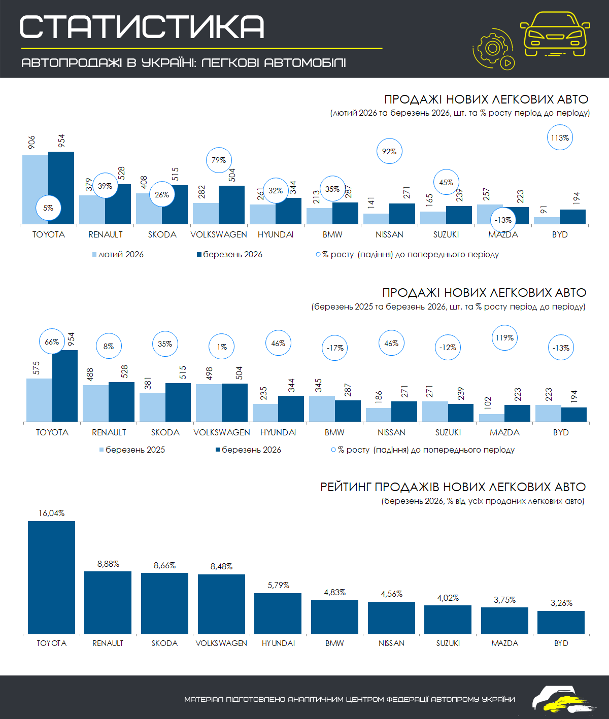 У розрізі брендів у березні найбільшу частку ринку має Toyota – 16,0%. Далі йдуть Renault (8,9%), Skoda (8,7%) та Volkswagen (8,5%). До топ-10 також входять Hyundai, BMW, Nissan, Suzuki, Mazda та BYD.