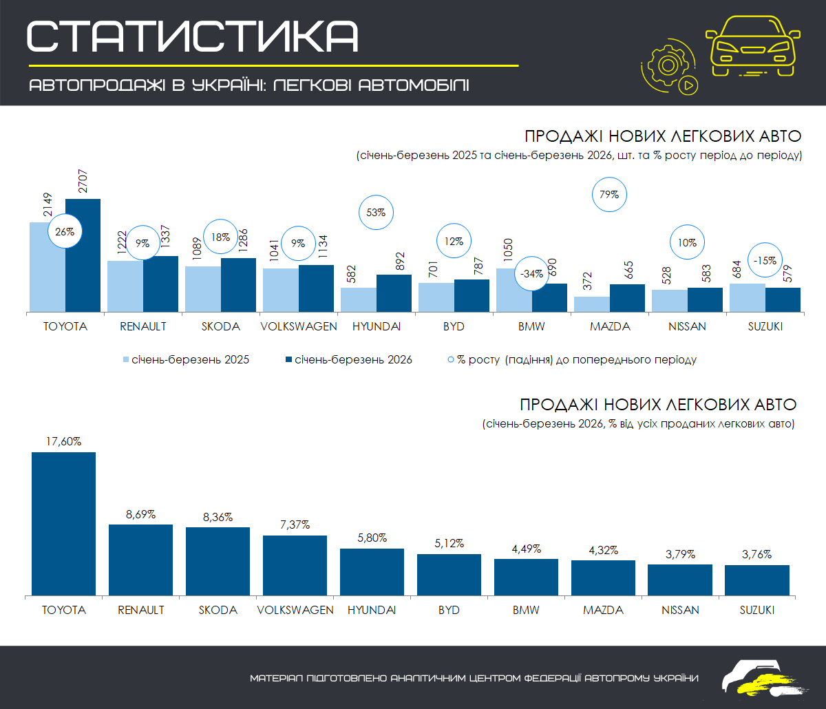 За підсумками першого кварталу 2026 року Toyota також має найбільшу частку – 17,6%. Далі розташувалися Renault (8,7%), Skoda (8,4%) та Volkswagen (7,4%).