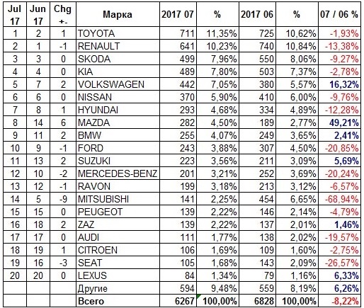 Как сообщает Auto-Consulting, в июле 2017 года на украинском рынке новых легковых автомобилей наметился небольшой спад – продано 6267 машин, что на 8,22% меньше, чем в июне. Свою роль в этом сыграли отпускной период, хакерские атаки и скачки курса на валютном рынке.