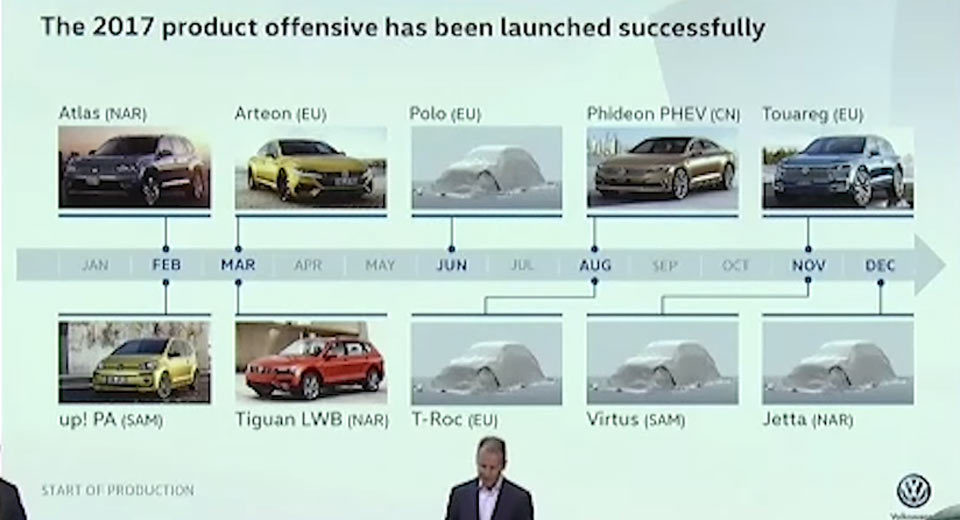 До конца 2017 года состоится старт продаж VolkswagenPhideonPHEV. Правда, первым делом новый флагманский седан с гибридной установкой поступит в продажу в Китае. О сроках и перспективах появления VolkswagenPhideon в Европе точных данных пока что. Еще одна ожидаемая новинка — компактный кроссовер VolkswagenT-Roc. Новый SUV от Фольксвагена представят на мотор-шоу во Франкфурте, после чего появится в автосалонах Европы. Небольшой «паркетник» разделяет платформу (модульная MQB-A0) с новым SEATIbiza. Также немцы напоминают про семиместный кроссовер VolkswagenAtlas 2017 (также известный как Teramont), купить которого в Украине можно будет с конца года, и длиннобазный VWTiguanLWB. Помимо перспектив на текущий год, в немецкой компании поделились планами на ближайшее будущее. Согласно им, VW намерен ежегодно выводить на рынок как минимум 2 абсолютно новые модели. Так, в 2018-м году дебютирует два новых седана, а в течение следующих двух лет – четыре кроссовера.