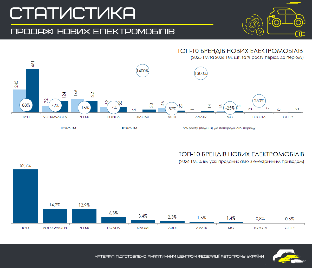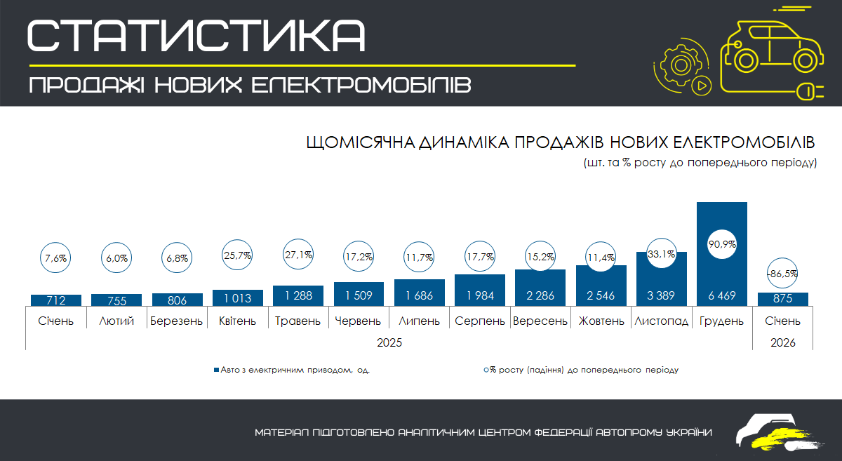 У січні 2026 року в Україні було реалізовано 875 нових електромобілів, що на 22,9% більше, ніж у січні 2025 року (712 од.). Частка електромобілів у загальному обсязі продажів нових авто склала 17,35%.