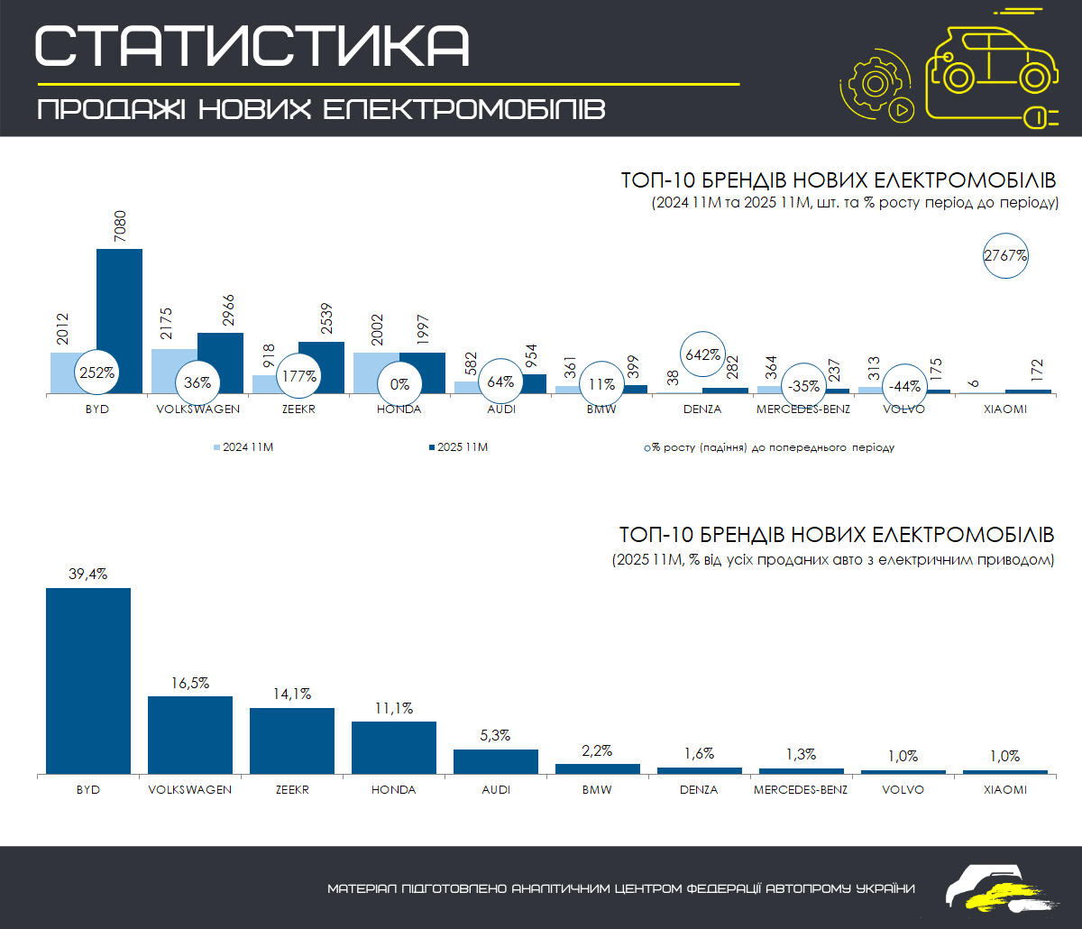 Найпопулярнішими брендами стали BYD, Volkswagen та Zeekr – усі вони продемонстрували значне річне зростання.