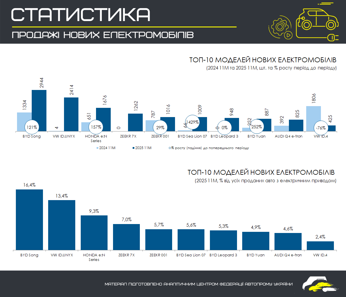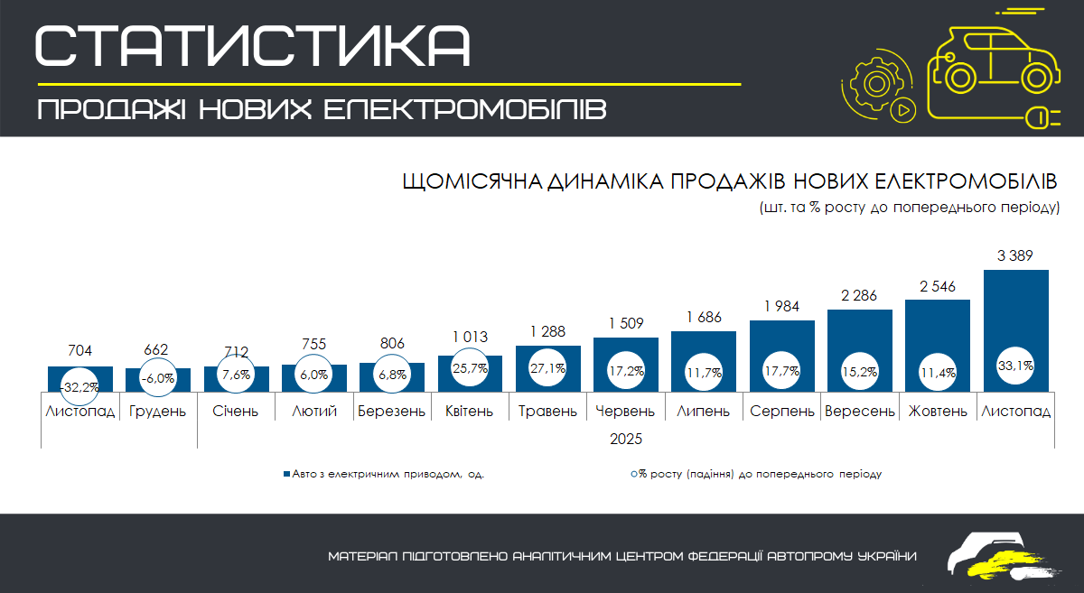 У листопаді 2025 року в Україні продано 3 389 нових електромобілів, що на 33,1% більше, ніж у жовтні. Це найвищий місячний результат з початку року та новий рекорд ринку.