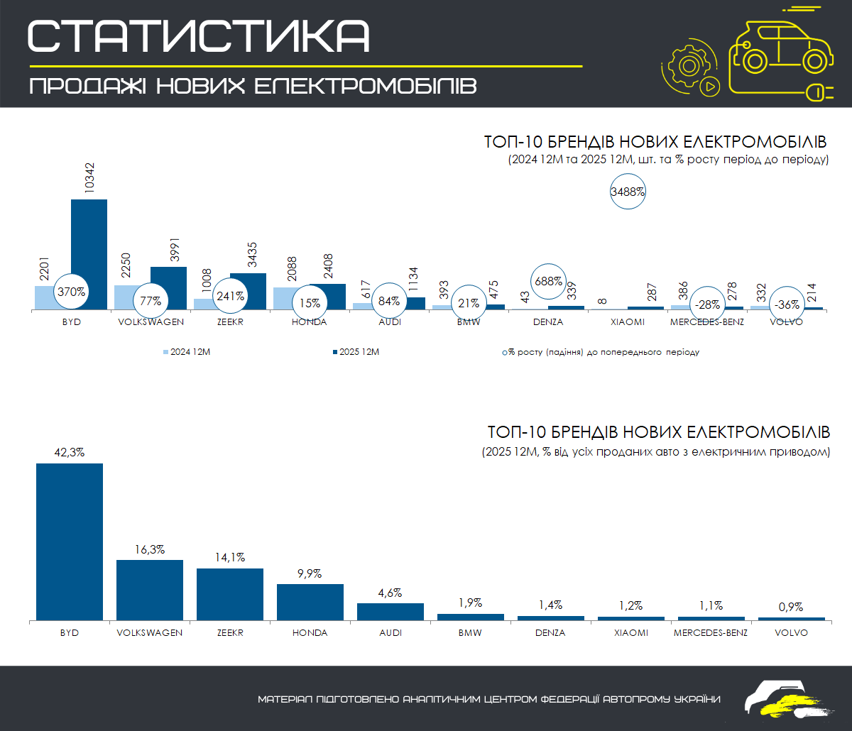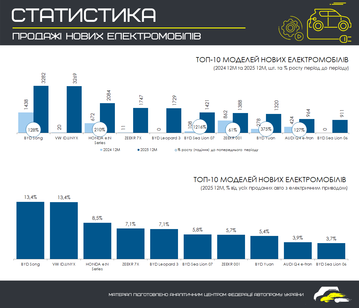 Структурно ринок електромобілів у 2025 році формувався під суттєвим впливом китайських брендів. BYD став беззаперечним лідером сегмента, забезпечивши понад 42% усіх продажів нових електромобілів за рік, тоді як Volkswagen та Zeekr закріпилися у трійці лідерів із двозначною часткою ринку. У модельному розрізі найвищі обсяги продажів продемонстрували BYD Song, VW ID. UNYX та Honda e:N Series, що разом сформували понад третину усіх реєстрацій електромобілів у 2025 році.