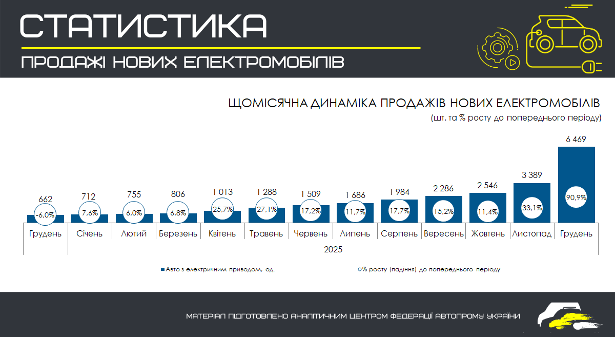 У грудні 2025 року в Україні було реалізовано 6 469 нових електромобілів, що стало абсолютним місячним рекордом для ринку. Порівняно з груднем 2024 року продажі зросли у 9,8 разів, а частка електромобілів у структурі ринку нових легкових авто вперше перевищила 50% і досягла 50,8%.