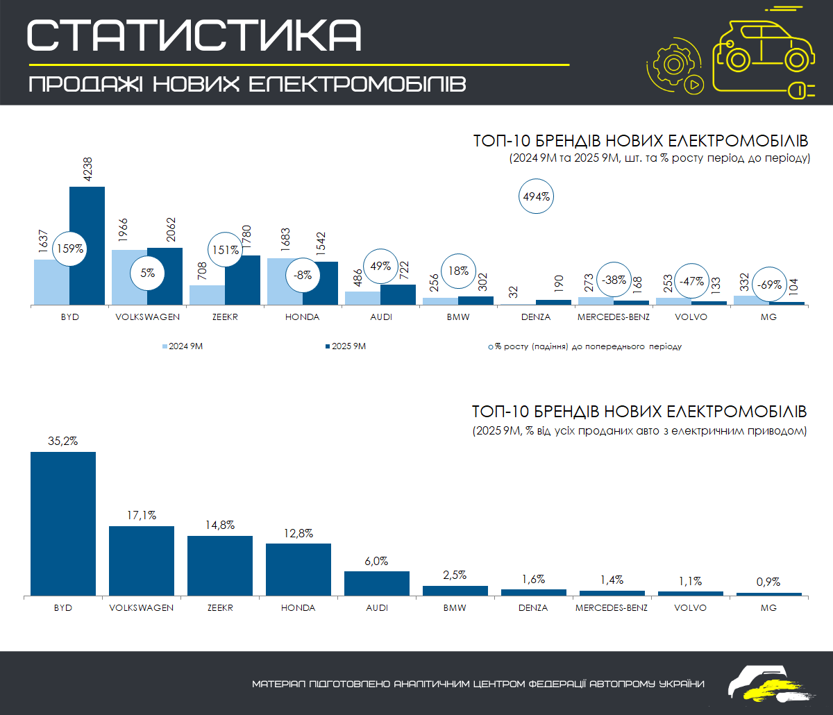 Беззаперечним лідером українського ринку залишається BYD, який утримує 35,2% частки продажів і демонструє зростання на 159% у порівнянні з минулим роком.