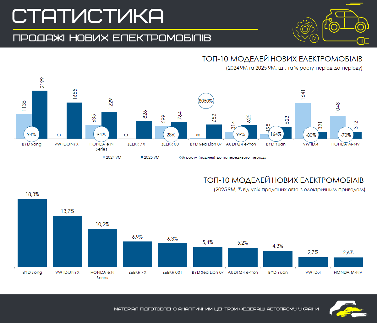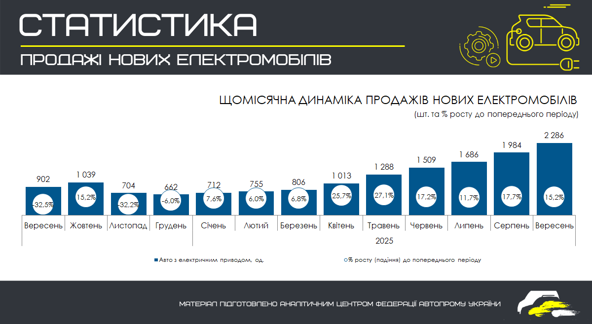 У вересні 2025 року в Україні продано 2 286 нових електромобілів, що на 15,2% більше, ніж у серпні, та у 2,5 раза перевищує показник вересня 2024 року. Це новий рекорд місячних продажів.