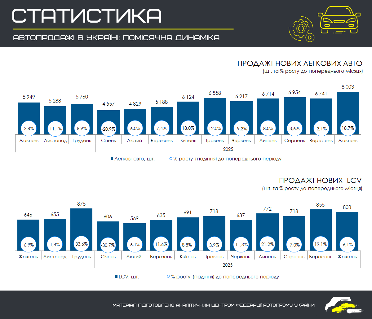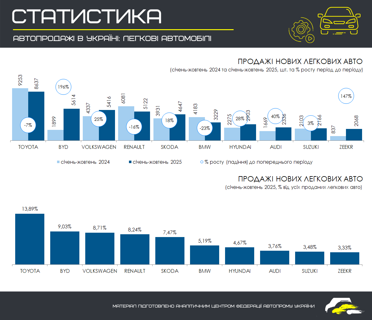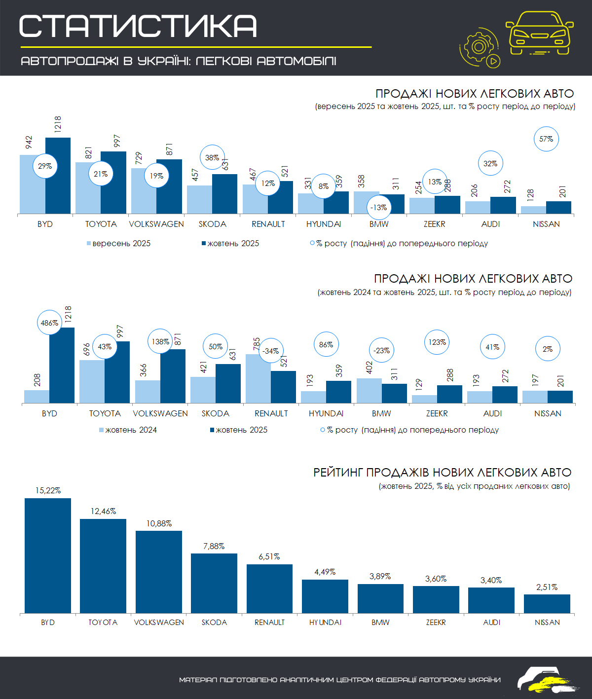 Отже, у жовтні український авторинок зріс на 34,5%, у порівнянні з минулим роком Зростання було +18,7% і у порівнянні з вереснем. Таким чином, за 10 місяців український ринок вже перебуває у плюсовій зоні (+3,18%) і впевнено рухається до ще більш результативних місяців кінці 2025 року.